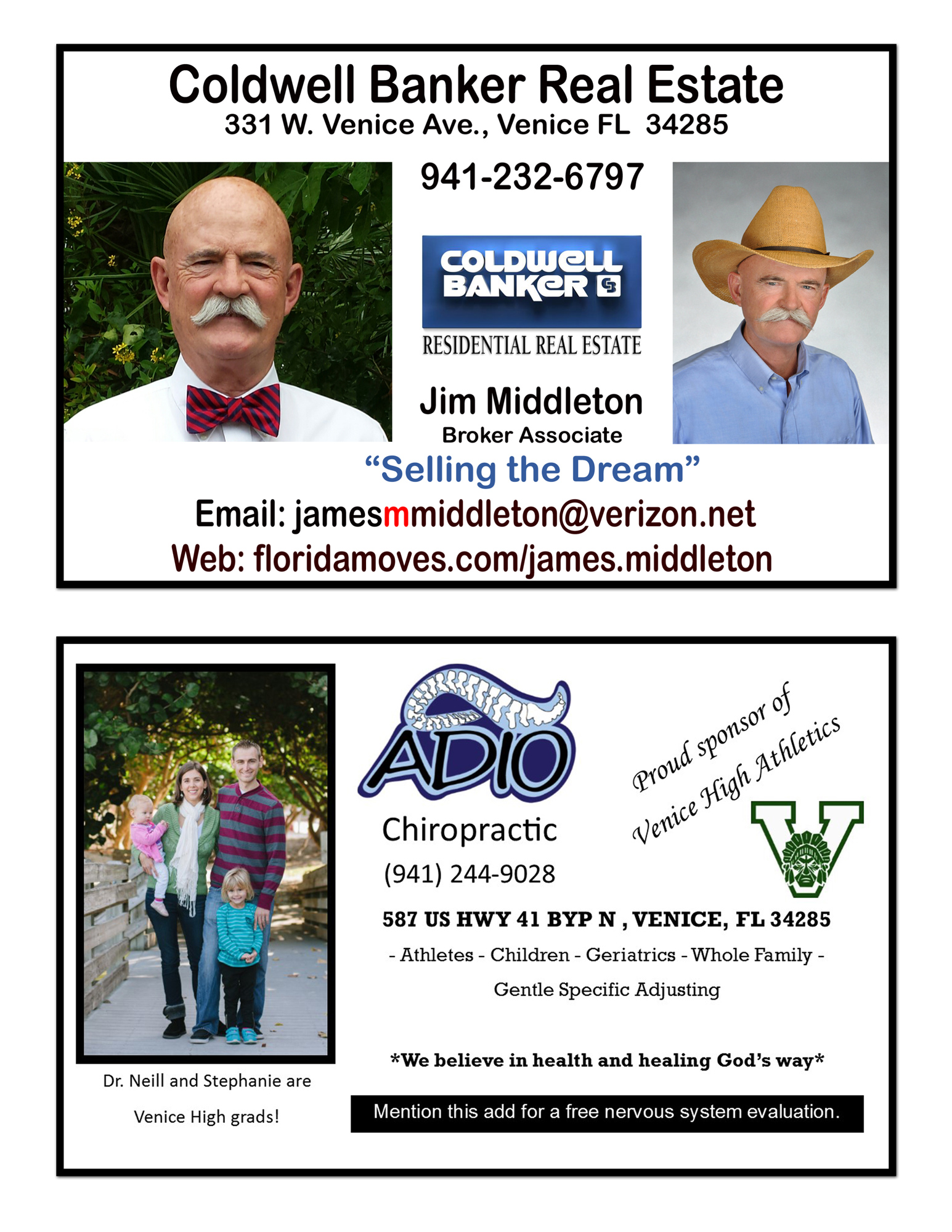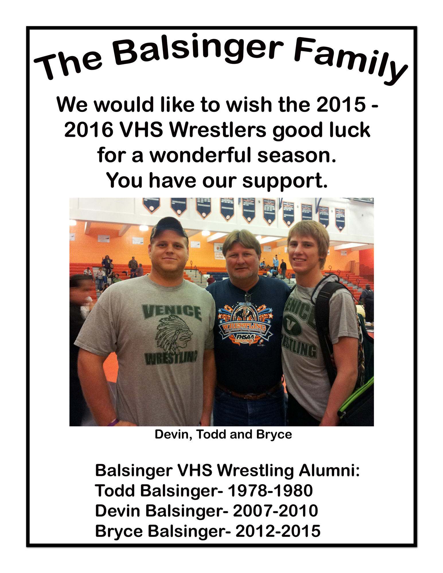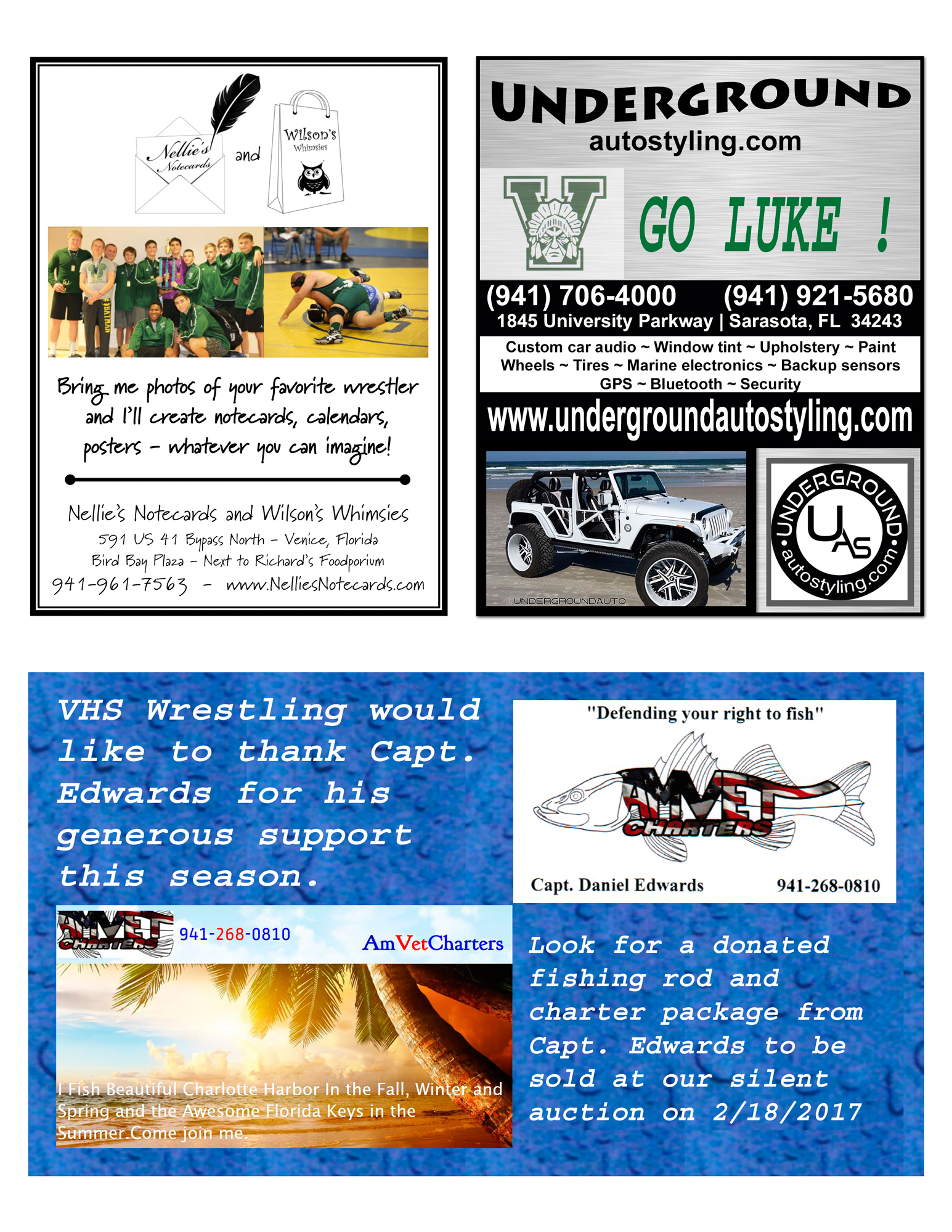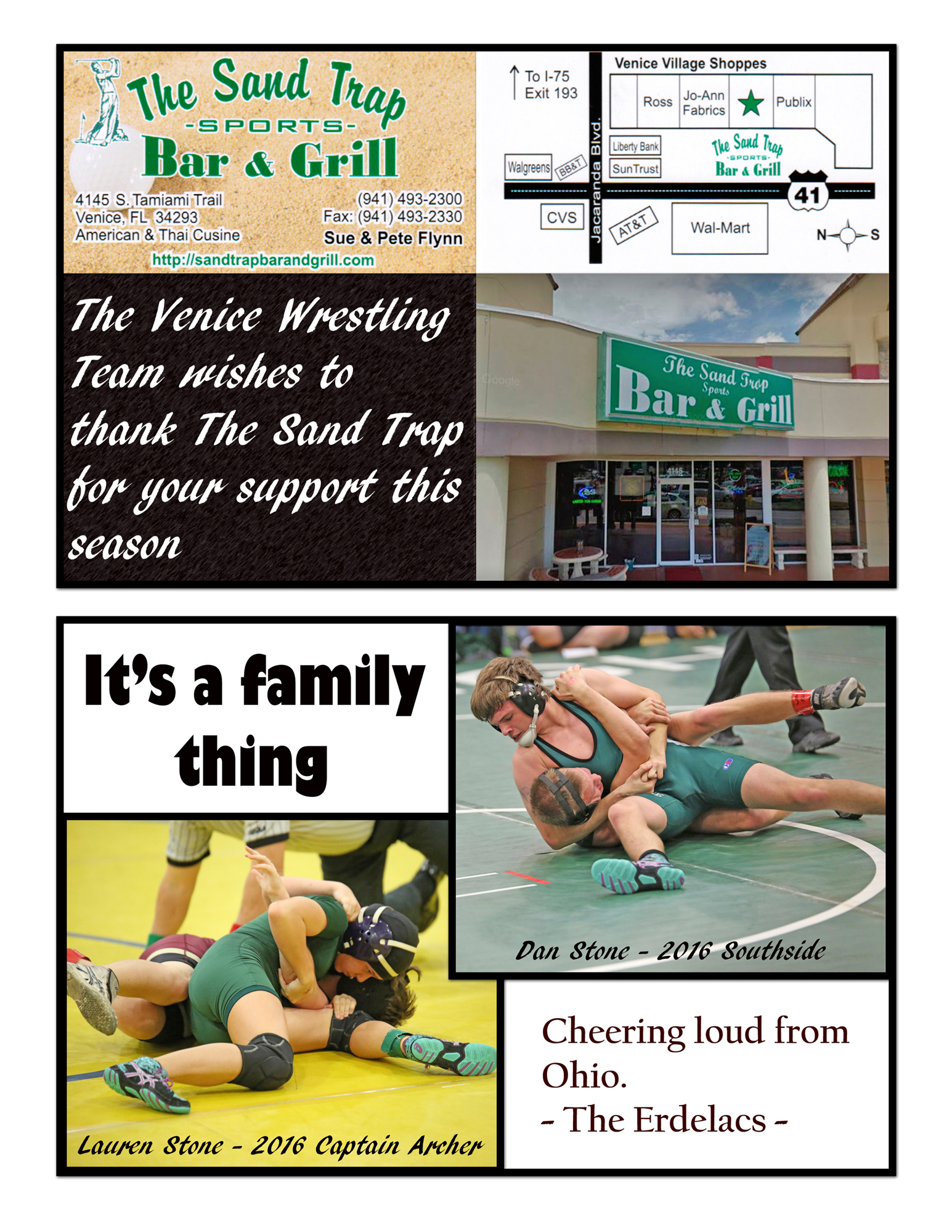 On this page you will find examples (click on thumbnail for a larger image) of various types of sponsorship recognition that appear in our annual printed wrestling program. Recognition can be either family oriented in support of a specific wrestler(s), as well as business related advertisements. Our organization gladly accepts donations anytime, and are particularly needed during our primary fund-raising season (November – March). The Venice Takedown Club, a Florida non-profit, is also a registered 501(c)(3) public charity. All funds benefit the Venice High School Wrestling Team and Venice Warriors Youth Wrestling Program by paying for expenses such as hotel and travel costs, uniforms, equipment, instructional camps, awards and more. (Click here to pay or donate via Paypal / credit card) Required Statement: A copy of the official Venice Takedown Club, Inc. registration and financial information may be obtained from the Division of Consumer Services by calling toll free within Florida (800-435-7352), or visiting their website (FDACS.gov). Registration does not imply endorsement, approval, or recommendation by the state.